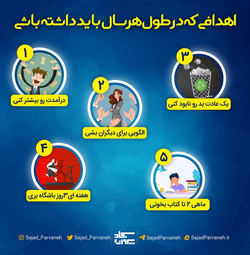 برای خودتون تو زندگی اهدافی رو مشخص کنید، کوتاه مدت و بلند مدت اهدافی که روند زندگیتون رو میتونه تغییر بده و رسیدن بهش براتون آرزو نمونه.